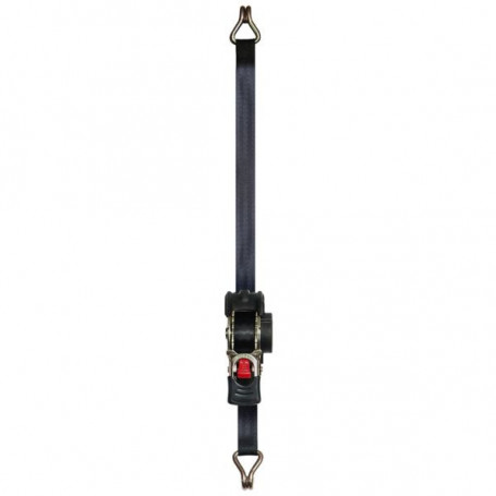 Système d'arrimage auto-rétractable, sangle tissée. Idéale pour arrimer des charges sur plateau, remorques et arrimage intérieur. Mise en tension de la sangle cran par cran. D’une simple pression sur le poussoir rouge, la sangle est enroulée. Partie courte et partie longue solidaires. Conforme à la norme EN 12195-2