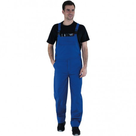 Disponible en 1 qualité de tissu : 60% coton, 40% polyester - Croisé, 315 gm². Bretelles élastiquée à boucles clic clac, braguette zippée, fermeture côtés par bouton rivet. 2 poches italiennes, 1 poche bavette, 1 poche cuisse, 1 poche mètre, 1 poche revolver. Bas de jambes réglables, mercerie tout plastique. Entrejambe : 82 cm Entretien : lavage industriel 15797 8A Coloris : bleu marine, bleu bugatti, bleu azur, bleu métal, blanc, noir, minéral gris, gris foncé, vert bouteille, rouge Taille : 0 à 6
